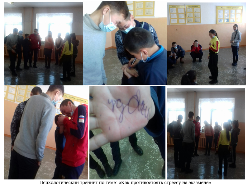 Консультации по математике и русскому языку в 9, 11 классах. 11 класс — охват 6 учащихся. 9 класс — 22 учащихся. Психологический тренинг в 9″а» классе. По теме: «Как противостоять стрессу на экзамене». Охват 9 учащихся.