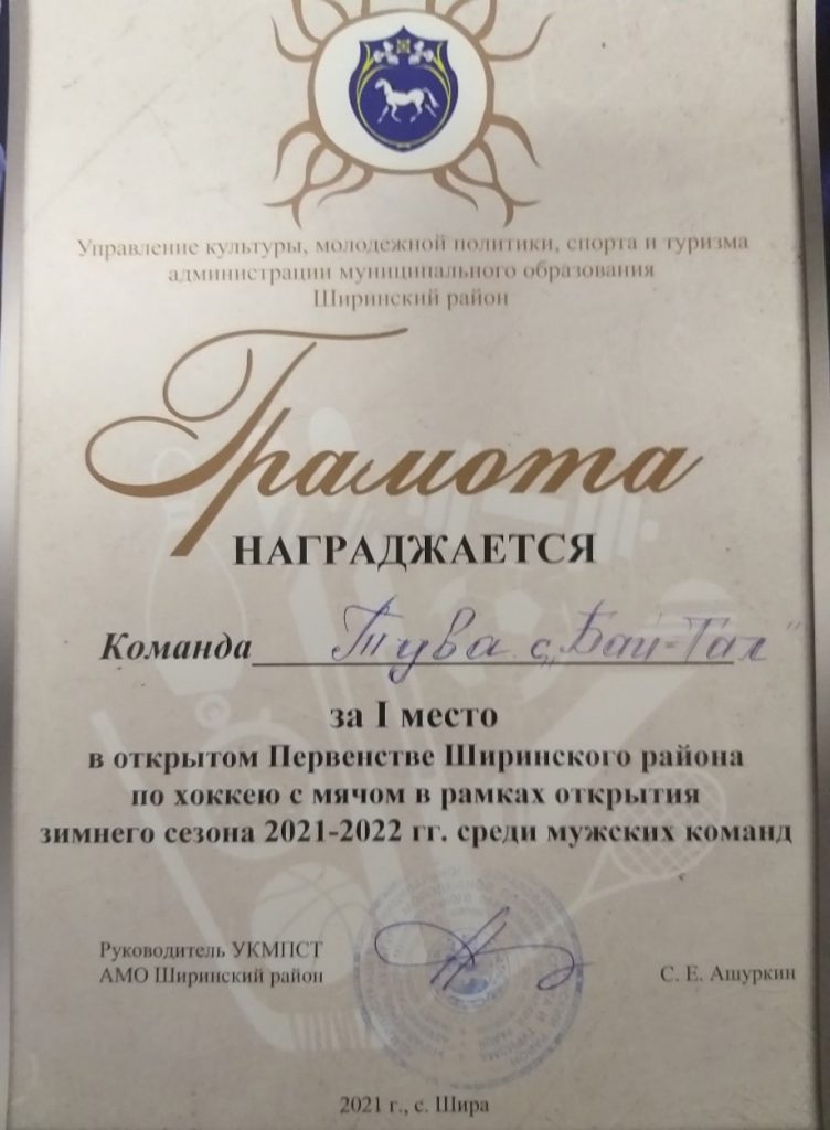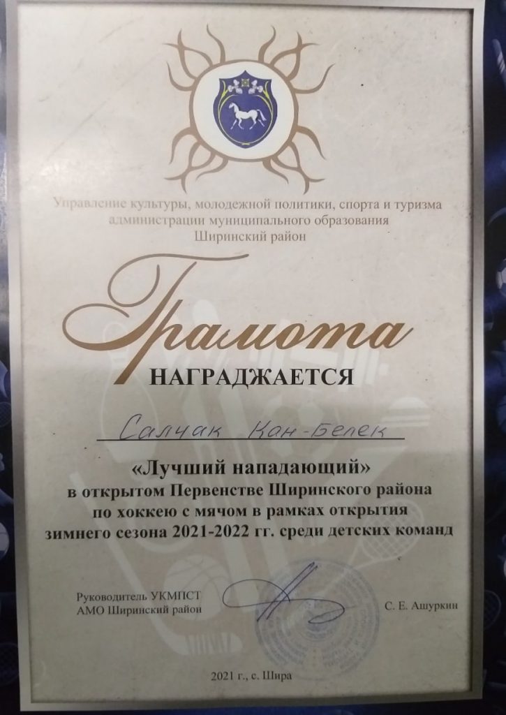 Опубликовано 18.12.202120.12.2021 Автор: adminГалерея ШСК «Монгулек» Команда учащихся Бай-Талской школы стали чемпионами в Открытом Первенстве Ширинского района по хоккею с мячом в рамках открытия зимнего сезона 2021-2022 гг. среди мужских команд.Салчак Каң-Белек стал «Лучшим нападающим».
