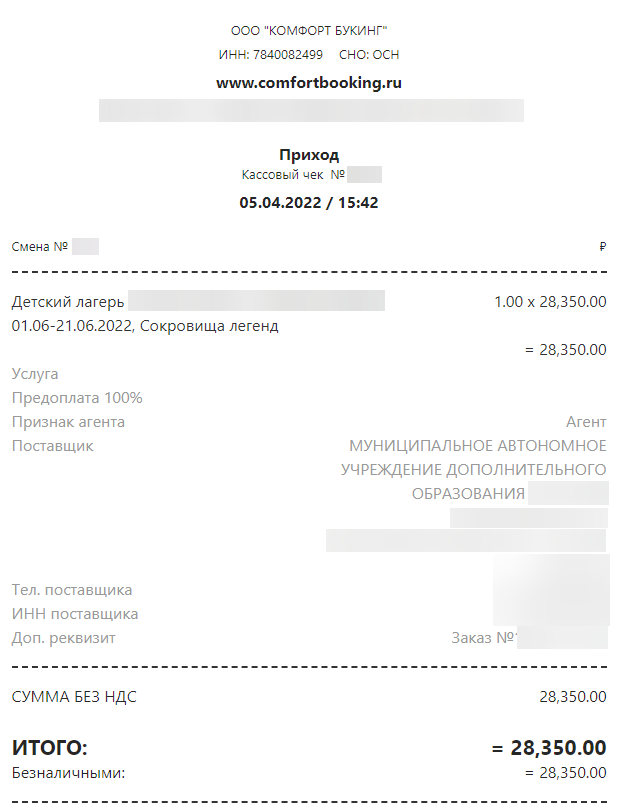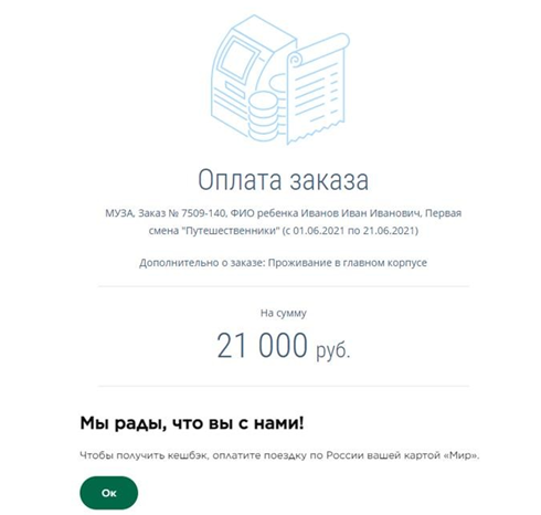 1. Перейдите по ссылке на оплату, которую выслал вам лагерь. Проверьте данные заказа: сверьте Ф. И. О. ребенка и информацию о смене. Ссылка на оплату может