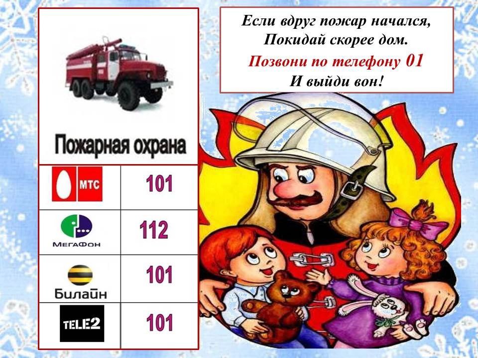 ∙ При пожаре звонить 01, 010, 112 (назвать свой адрес, телефон, фамилию и что горит)!